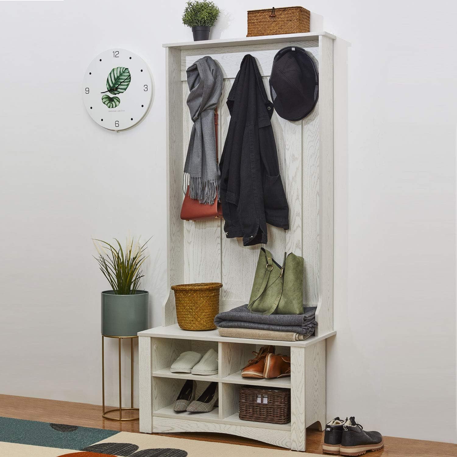 Uncategorized White Entryway Bench And Coat Rack - Yamazaki white adjustable branch coat rack. Shelf with hooks and also on the bench there are plants.